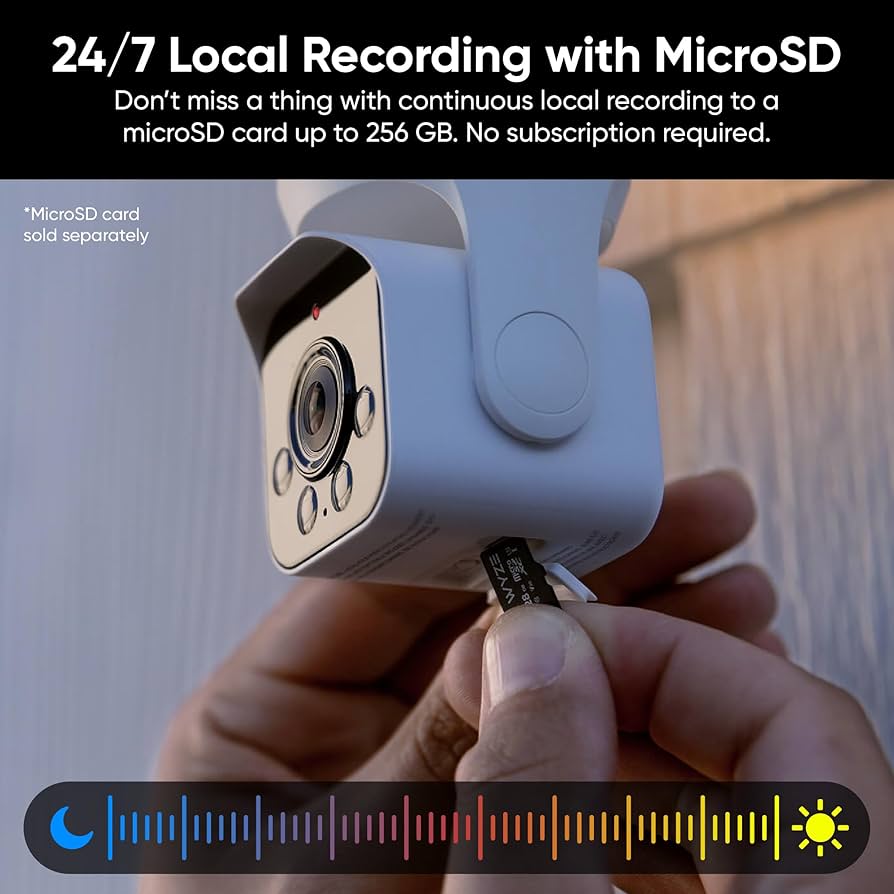 Never miss a moment. The camera supports continuous 24/7 local recording directly to a MicroSD card (up to 256GB, sold separately). This means you can keep a secure history of your footage without being forced into a monthly subscription service.