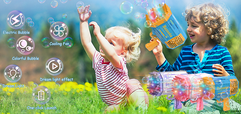 This bubble machine has 64/36/32 bubble holes, realistic design and cool appearance, pull the trigger and instantly shoot thousands of colorful bubbles in the sky. The LED light design makes the Bubble Maker more dazzling under the bubble reflector light at night!