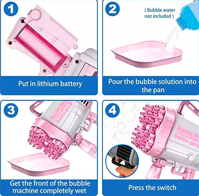 The bazooka bubble machine gun fan is made of soft sponge rotor blades, high speed motor, more wind power, when you are tired from playing and feel hot, the bubble gun can be used as a small fan to bring you cool and pleasant wind.